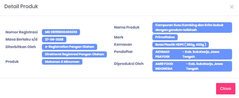 • Nomor registrasi BPOM Primaflakes akan muncul di laman cek produk BPOM.